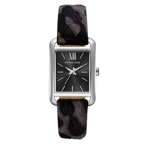 Silver-tone stainless steel case with a black leather strap. Fixed silver-tone stainless steel bezel. Black dial with silver-tone hands and index hour markers. Dial Type: Analog. Quartz movement. Scratch resistant mineral crystal. Rectangle case shape, case size: 40 mm, case thickness: 10 mm. Band width: 20 mm, band length: 7.5 inches. Buckle clasp. Water resistant at 30 meters / 100 feet. Functions: hour, minute, second. Monroe Series. Fashion watch style. Michael Kors Monroe Quartz Black Dial Ladies Watch MKO1199.