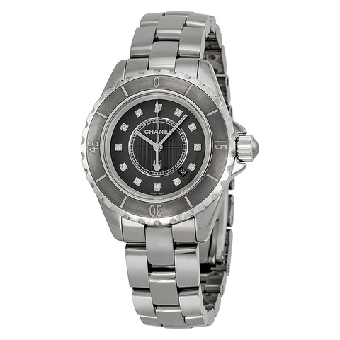 Pre-owned Titanium ceramic case with a titanium bracelet. Fixed bezel. Titanium dial with silver-tone hands and diamond hour markers. Minute markers around an inner ring. Dial Type: Analog. Date display between 4 and 5 o'clock position. Quartz movement. Scratch resistant sapphire crystal. Solid case back. Case diameter: 33 mm. Round case shape. Deployment with push button clasp. Water resistant at 200 meters/ 660 feet. Functions: date, hour, minute, second. Casual watch style. Watch label: Swiss Made. Chanel J12 Titanium Ladies Watch H3241.
