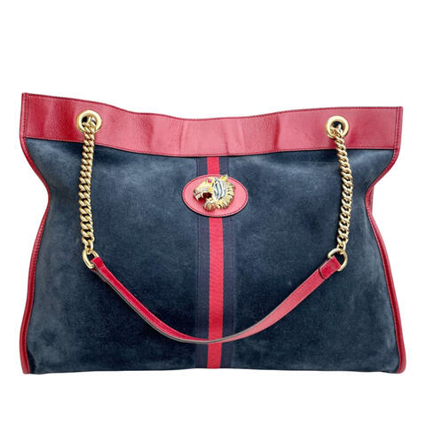 The Gucci Large Web Suede Rajah Tote is a striking designer handbag that blends iconic detailing with everyday sophistication. Crafted from rich suede with smooth leather trim, this tote is accented by a signature gold-tone tiger head detail, chain link straps with leather guards, and an open top with a magnetic snap closure for easy access. Spacious yet refined, it also includes an interior zip pouch to help keep essentials organized, making it a standout accessory that embodies luxury and contemporary style.<br /><br /> Designed for both fashion and functionality, this pre-owned Gucci Large Web Suede Rajah Tote offers a roomy silhouette that is ideal for carrying your daily essentials in style. Measuring approximately 13.58 x 17.52 x 2.56 inches, it provides generous space while maintaining a sleek, elevated look. Complete with a dust bag, pouch, and box, this statement tote is a versatile addition to any designer handbag collection and is perfect for everyday use.<br /><br /> Pre-owned Gucci Large Web Suede Rajah Tote Ladies 537219 493075. Model: Large Web Suede Rajah Tote. Item# J2FNKL1V177522MR. Condition Rating: B+. Comments: Exterior Back Worn, Discolored, Creased. Exterior Bottom Discolored. Exterior Front Discolored, Cracked, Worn. Exterior Handle/Strap Scratched. Hardware Practical Attachment Scratched. Interior Lining Stained With Others, Worn. This is a great opportunity to own an authentic handbag at a more accessible price.