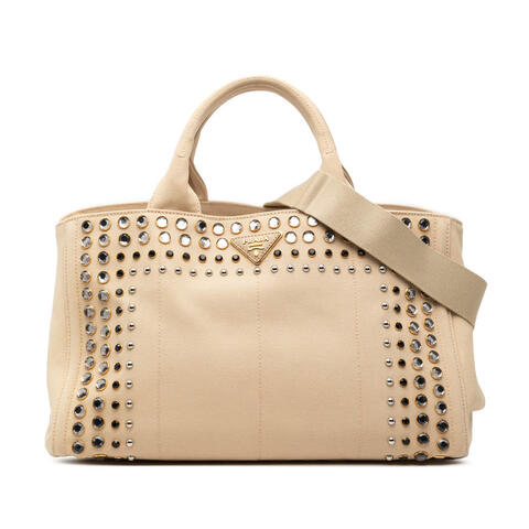 The Prada Canvas Canapa Bijoux Satchel is a chic and versatile designer handbag that blends iconic craftsmanship with standout appeal. Crafted from durable canvas with elegant studded detailing, this satchel features rolled top handles, a detachable flat shoulder strap, an open top, and convenient interior zip and slip pockets for organized storage. Its structured silhouette and spacious design make it a stylish choice for day-to-day wear, offering luxury and contemporary style.<br /><br /> Designed for both fashion and functionality, this pre-owned Prada satchel offers ample space for your daily essentials while maintaining a polished, sophisticated look. The included shoulder strap adds carrying versatility, allowing you to wear it by hand or over the shoulder with ease. Whether you're heading to work, shopping, or meeting friends, this designer bag is a fashionable and practical accessory that is perfect for everyday use.<br /><br /> This authentic pre-owned Prada Canvas Canapa Bijoux Satchel measures approximately 9.06 x 14.96 x 9.06 inches and includes the shoulder strap. Condition Rating: B+. Comments: Exterior Back Stained With Others. Exterior Bottom Stained With Others. Exterior Corners Worn. Exterior Front Stained With Others. Exterior Handle/Strap Worn, Stained With Others. Exterior Top Stained With Others. Hardware Closure Scratched. Hardware Embellishment Scratched. Hardware Practical Attachment Scratched. Zipper Scratched. Interior Lining Stained With Others, Stained With Mold. Interior Pocket Stained With Mold, Stained With Others. With its blend of designer appeal and functional style, this is a great opportunity to own an authentic handbag at a more accessible price.