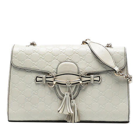 The Gucci Medium Guccissima Emily Shoulder Bag is a sophisticated designer handbag crafted from embossed leather, featuring the iconic Guccissima pattern for a refined and instantly recognizable look. Styled with a curb chain strap, a front flap with a slip-through closure, elegant tassel detail, and interior slip pockets, this medium Gucci shoulder bag offers a polished silhouette that complements both day and evening outfits with luxury and contemporary style. <br /><br /> Designed for both fashion and functionality, this pre-owned Gucci handbag offers a compact yet practical interior with dimensions of 7.09 x 11.61 x 2.76 inches, making it ideal for carrying your daily essentials in style. The chain strap and organized interior pockets add versatility and convenience, while the timeless design makes it a smart choice for anyone searching for an authentic Gucci Emily bag that is perfect for everyday use. <br /><br /> This pre-owned Gucci Medium Guccissima Emily Shoulder Bag is rated B+ condition. Comments: Exterior Back Worn, Stained With Others. Exterior Bottom Worn, Out of Shape, Stained With Others. Exterior Front Stained With Others. Exterior Handle/Strap Scratched, Stained With Others, Worn. Exterior Side Creased, Stained With Others. Exterior Top Stained With Others. Hardware Practical Attachment Rusty/Tarnished, Scratched. Interior Lining Stained With Transfer of Color, Stained With Others. Interior Pocket Stained With Others. Inclusions: None. Model: Medium Guccissima Emily Shoulder Bag. Item# 2GT7H8KZS52TJ75C. Pre-owned Gucci Medium Guccissima Emily Shoulder Bag Ladies 295402 001998. This is a great opportunity to own an authentic handbag at a more accessible price.