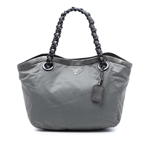 The Pre-owned Prada Metallic Leather Trimmed Tessuto Tote is a stylish designer handbag that blends Pradas signature sophistication with everyday versatility. Crafted with a durable nylon body, elegant leather trim, and leather-woven plastic chain straps, this tote offers a refined look that complements both casual and polished outfits. The open top with magnetic snap closure provides easy access to your essentials, while the spacious silhouette makes it a practical choice for daily wear, delivering luxury and contemporary style.<br /><br /> Designed for both fashion and functionality, this Prada tote features an interior zip pocket to help keep your belongings organized and secure. With dimensions of approximately 11.81 x 13.78 x 6.30 inches, it offers ample room for your wallet, phone, cosmetics, and other daily necessities without sacrificing its sleek designer appeal. Whether you are heading to work, shopping, or meeting friends, this authentic Prada handbag is a chic and reliable accessory that is perfect for everyday use.<br /><br /> This authentic Prada Metallic Leather Trimmed Tessuto Tote is an excellent option for buyers seeking a timeless luxury handbag at a better value. Inclusions: Name tag. Model: Metallic Leather Trimmed Tessuto Tote. Item# RFWRG57BQ1AE0R8H. Condition Rating: B+. Comments: Exterior Back Worn. Exterior Corners Worn. Exterior Front Stained With Others. Exterior Handle/Strap Worn. Exterior Side Stained With Others, Worn. Exterior Top Worn. Hardware Closure Scratched. Hardware Practical Attachment Scratched. Zipper Scratched. Interior Lining Worn, Split. This is a great opportunity to own an authentic handbag at a more accessible price.