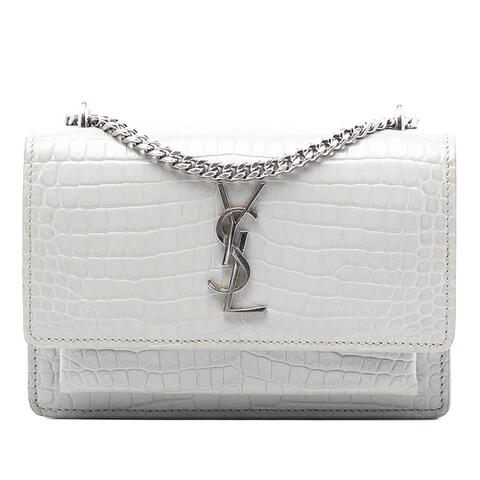 The Saint Laurent Mini Croc Embossed Leather Monogram Sunset Wallet on Chain is a refined designer accessory that blends elegance with everyday versatility. Crafted from embossed leather, this chic piece features the iconic Sunset silhouette, a chain link strap with a leather guard, a top flap with magnetic snap closure, and interior zip and slip pockets for organized storage. Its compact dimensions of 4.53 x 6.69 x 1.57 inches make it an ideal choice for carrying essentials while showcasing luxury and contemporary style. <br /><br /> Designed for both fashion and functionality, this Saint Laurent wallet on chain offers a polished look that transitions effortlessly from day to evening. The embossed croc-effect leather adds sophisticated texture, while the thoughtfully designed interior pockets help keep cards, cash, and small necessities neatly arranged. Whether worn as a stylish crossbody or carried for special occasions, this designer handbag is perfect for everyday use. <br /><br /> This pre-owned Saint Laurent Mini Croc Embossed Leather Monogram Sunset Wallet on Chain is a smart choice for buyers seeking authentic luxury at a more attainable value. Condition Rating: B+. Comments: Exterior Back Scratched, Creased, Stained With Others. Exterior Bottom Scratched, Stained With Others. Exterior Corners Worn. Exterior Front Creased, Stained With Others. Exterior Handle/Strap Worn, Scratched, Stained With Others. Exterior Side Cracked, Stained With Others. Exterior Top Stained With Others. Hardware Closure Scratched. Hardware Practical Attachment Scratched. Zipper Scratched. Interior Lining Cracked, Stained With Others. Inclusions: None. Model: Mini Croc Embossed Leather Monogram Sunset Wallet on Chain. Item# SAVLX1370ETP1HTT. This is a great opportunity to own an authentic handbag at a more accessible price.
