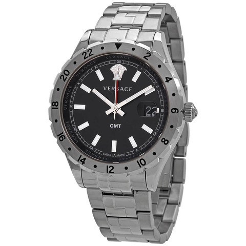 Silver-tone stainless steel case with a silver-tone stainless steel bracelet. Fixed silver-tone stainless steel bezel. Black dial with luminous grey hands and index hour markers. Minute markers around the outer rim. Dial Type: Analog. Luminescent hands and markers. Date display at the 3 o'clock position. Ronda 515 quartz movement. Scratch resistant sapphire crystal. Solid case back. Case size: 42 mm. Case thickness: 10 mm. Round case shape. Deployment with double push button release clasp. Water resistant at 50 meters / 165 feet. Functions: GMT, second time zone, hour, minute, second, date. Dress watch style. Watch label: Swiss Made. Versace Hellenyium GMT Black Dial Mens Watch V1102 0015.