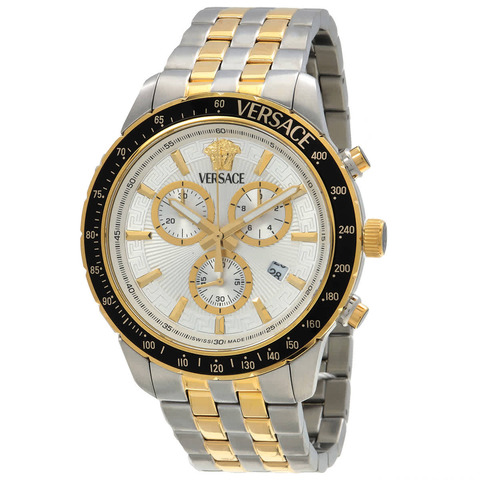 Silver-tone stainless steel case with a two-tone (silver-tone and gold-tone) stainless steel bracelet. Fixed black stainless steel bezel. Silver dial with gold-tone hands and index hour markers. Minute markers around the outer rim. Dial Type: Analog. Date display at the 4 o'clock position. Chronograph - three sub-dials displaying: 60 second, 30 minute and 1/10th of a second. Quartz movement. Scratch resistant sapphire crystal. Pull / push crown. Solid case back. Round case shape, case size: 44 mm. Deployment with push button release clasp. Water resistant at 50 meters / 165 feet. Functions: chronograph, date, hour, minute, second. Sport Chrono Series. Sport watch style. Watch label: Swiss Made. Versace Sport Chrono Quartz Silver Dial Mens Watch VEZCA0624.