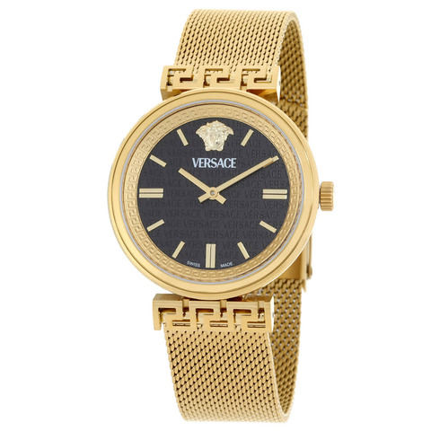 Gold-tone stainless steel case with a gold-tone stainless steel mesh bracelet. Fixed gold-tone stainless steel bezel. Black dial with gold-tone hands and index hour markers. Dial Type: Analog. Quartz movement. Scratch resistant sapphire crystal. Pull / push crown. Solid case back. Round case shape, case size: 36 mm. Band width: 18 mm. Sliding clasp. Water resistant at 50 meters / 165 feet. Functions: hour, minute. Mythos Series. Casual watch style. Watch label: Swiss Made. Versace Mythos Quartz Black Dial Ladies Watch VETCA0724.