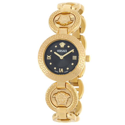Gold-tone stainless steel case and bracelet. Fixed gold-tone stainless steel bezel. Black dial with gold-tone hands and index-Roman numeral hour markers. Dial Type: Analog. Quartz movement. Scratch resistant sapphire crystal. Pull / push crown. Solid case back. Round case shape, case size: 28 mm. Jewelry clasp. Water resistant at 50 meters / 165 feet. Functions: hour, minute. Greca Jewel Series. Casual watch style. Watch label: Swiss Made. Versace Greca Jewel Quartz Black Dial Ladies Watch VEWCA0624.