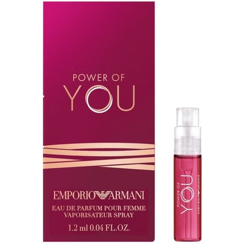 Launch year: 2026. Fragrance Family: Floral Fruity Gourmand. Top notes: Passionfruit, Bitter orange, Lemon. Heart notes: Frangipani, Solar notes. Base notes: Madagascar vanilla, Benzoin, Labdanum. Design house: Emporio Armani. Design house category: fashion. Design house country: Italy. Scent name: Power Of You. Gender: Ladies. Category: Fragrance. SubType: EDP Spray. Size: 0.04 oz. Barcode: 3614274752073. Emporio Armani Ladies Power Of You EDP Spray 0.04 oz Fragrances 3614274752073. <br/><br/> This item is only valid for shipment in the Contiguous United States & Canada.