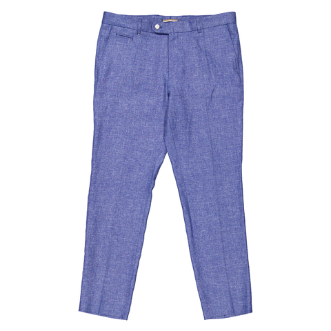 Hugo Boss Mens Bottoms. Fashion category: Pants & Leggings. SKU: 50515102-423. Color: Medium Blue. Hugo Boss C-Genius Micro Patterned Slim Fit Pants. These pants are made from a comfortable stretch linen blend fabric, featuring a subtle micro pattern, a zip fly closure, and a modern slim fit. Material: 61% Linen, 36% Lyocell, 2% Polyamide, 1% Elastane.