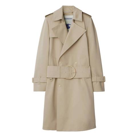 Burberry Ladies Outerwear. Fashion category: Coats & Jackets. SKU: 8087014. Color: Oat. Burberry Mid-Length Belted Trench Coat. A trench coat crafted from Italian-woven cotton silk, tailored to a slim fit with set-in sleeves and exaggerated epaulettes. The double-breasted design features notched lapels, long sleeves, and a wide D-ring belt that can be worn at two heights to adjust the silhouette from mid to low waist. Finished with diagonal side pockets and a central rear vent for ease of movement. Outer: 80% cotton, 20% silk. Lining: 100% viscose.
