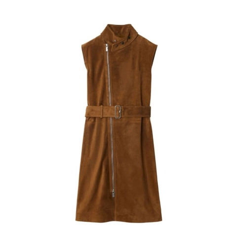 Burberry Ladies Dresses. SKU: 8092308. Color: Hazel. Sleeveless dress crafted from supple calf suede, inspired by archival Burberry motoring coats. Designed with a zip-front closure, wrap-around collar, and B buckle belt, finished in a regular fit. Specialist leather clean. 100% Calf Split Leather. Made in Italy.