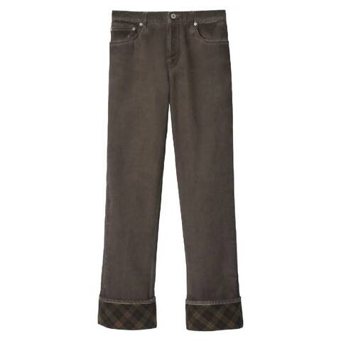 Burberry Ladies Bottoms. Fashion category: Jeans & Denim. SKU: 8099674. Color: Cinder. Burberry Check Pattern Wide Leg Cotton Jeans. These jeans feature five classic pockets and turn-up cuffs with a check pattern, adding a stylish twist to the design. The folded bracelets, hidden button closures, and stitched-back logo complete the look, blending timeless details with contemporary flair. 100% Cotton.