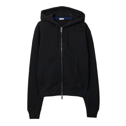 Burberry Ladies Tops. Fashion category: Hoodies & Sweatshirts. SKU: 8084964. Color: Black. Burberry Appliqued Equestrian Knight Cotton Hoodie. This hoodie is made from heavyweight cotton jersey, offering a relaxed fit for ultimate comfort. It features a tonal appliqued Equestrian Knight design, a zip closure, pouch pockets, and rib-knit trims for a refined touch. Material: 100% Cotton. Made in Portugal.
