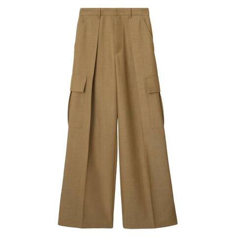 Burberry Ladies Bottoms. Fashion category: Pants & Leggings. SKU: 8094944. Color: Beige/Honey. Burberry Wide-Leg Pleated Cargo Trousers. These wool cargo trousers are tailored with pleat detailing and a high-waisted silhouette for a refined yet contemporary look. Designed with a concealed front fastening and belt loops, they feature two side cargo pockets, two side inset pockets, and two rear welt pockets for added functionality. A pressed crease and wide-leg cut complete the design, offering a sharp, structured finish. Outer: Wool 100%.
