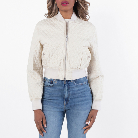 Burberry Ladies Outerwear. Fashion category: Coats & Jackets. SKU: 8093042. Color: Plaster. Burberry Cropped Quilted Bomber Jacket. This Cropped Quilted Bomber Jacket features a two-way front zip closure, a ribbed band collar, and long sleeves with a patch pocket on the left sleeve. Designed with quilted detailing throughout, it includes two side slant pockets with press-stud fastenings, ribbed cuffs and hem, and a straight cropped silhouette for a modern finish. 100% polyamide.