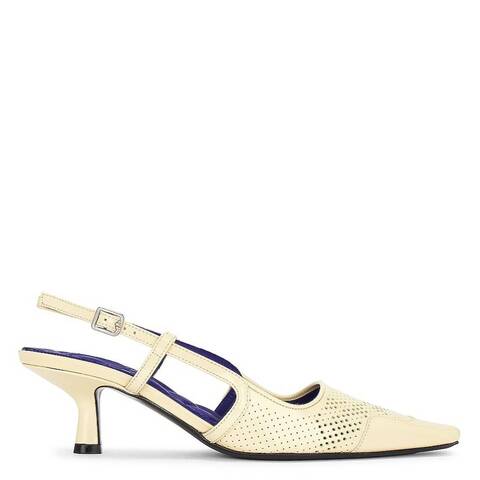 Burberry Ladies Heels. SKU: 8080285. Color: Daffodil. Burberry Chisel Leather Slingback Pumps. These slingback pumps are crafted from calf leather, perforated with a rose motif. Designed for comfort, they feature a padded quilted insole, a leather sole embossed with the Equestrian Knight Design, and a 2-inch heel. Outer: 100% calf leather. Made in Italy. <br/><br/><b>Please visit the brand website for sizing information.</b>