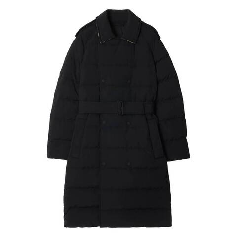 Burberry Ladies Outerwear. Fashion category: Coats & Jackets. SKU: 8097869. Color: Black/Sand Ip Check. Burberry Nylon Mid-Length Puffer Coat. This puffer coat is crafted from nylon and filled with goose down and feathers for lightweight warmth. Designed with a detachable belt to adjust the silhouette, it is appliqued with Burberrys B Shield motif inspired by the Equestrian Knight Design. It features a double-breasted press-stud closure, throat latch, epaulettes, side press-stud welt pockets, and a Burberry Check undercollar for a signature finish. Outer: 100% polyamide. Filling: 90% goose down, 10% goose feathers.