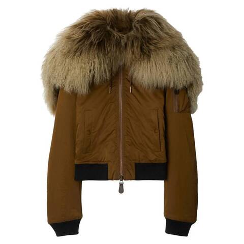 Burberry Ladies Outerwear. Fashion category: Coats & Jackets. SKU: 8097471. Color: Bison. Burberry Slim-Fit Padded Bomber Jacket. This slim-fit bomber jacket is crafted in Italy from washed nylon-blend satin. The quilted design features an oversized hood with sheepskin lining and a leather insert with the B Shield motif. Adjustable zippers on the sleeves and hood allow you to customize the silhouette. It includes a double-slider zipper closure, side welt pockets with snap closures and a zipper pocket on the sleeve. Outer: 58% polyester, 42% polyamide. Made in Italy.