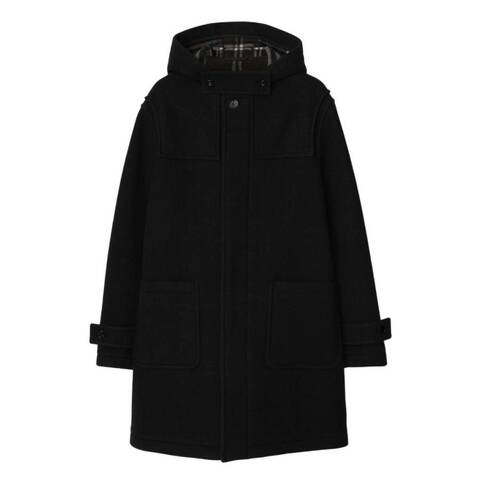 Burberry Mens Outerwear. Fashion category: Coats & Jackets. SKU: 8094247. Color: Black/Snug Ip Check. Burberry Single-Breasted Wool Duffle Coat. This duffle coat is crafted from double-faced wool and features a contrasting Burberry Check inner lining. Cut to a relaxed fit, it includes a single-breasted button closure, throat latch, front patch pockets, and button-tab cuffs, embodying the classic Burberry style. 100% Wool.