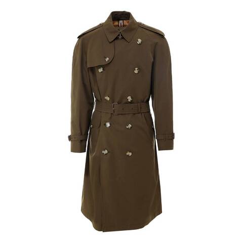Burberry Mens Outerwear. Fashion category: Coats & Jackets. SKU: 8028094. Color: Dark Military Khaki. Burberry Double Breasted Westminster Heritage Trench Coat. This coat features exquisite epaulettes, front storm-break and rear rain-break flaps, and adjustable straps at the cuffs for a tailored fit. Slant pockets, loops for a matching belt, a rear vent, and a double-breasted horn button fastening with a top hook add a refined, utilitarian edge to its sophisticated design. 100% Cotton.