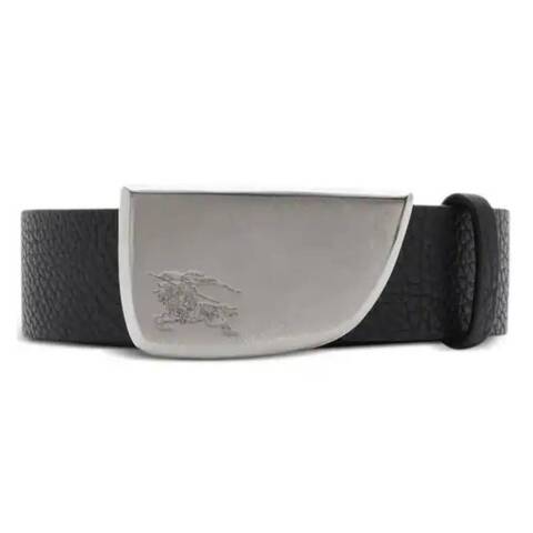 Burberry Mens Belts. Fashion category: Belts. SKU: 8087257. Color: Black. Burberry Shield Buckle Leather Belt. This belt is crafted from black grained calf leather and finished with a signature Equestrian Knight motif. Designed with a classic pin-buckle fastening, it features clean painted edges and polished silver-tone hardware. Height: 3 cm. 100% Leather. Made in Itay.