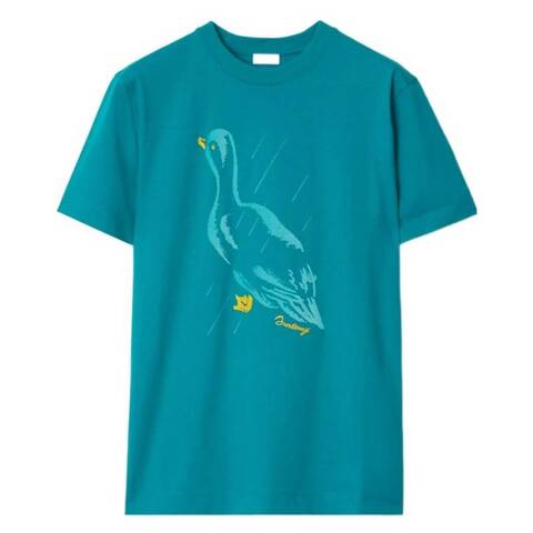 Burberry Mens Tops. Fashion category: T-Shirts & Henleys. SKU: 8095784. Color: Kingfisher. Burberry Duck Print Cotton Jersey T-Shirt. This cotton jersey T-shirt is cut to a slim fit for a clean, modern silhouette. It features a duck motif taken from an archive Burberry catalogue, screen-printed with a soft, flocked finish for added texture. Finished with a rib-knit neckline, short sleeves, a straight hem, and printed Burberry lettering. 100% cotton. Trim: 97% cotton, 3% elastane. Made in Italy.