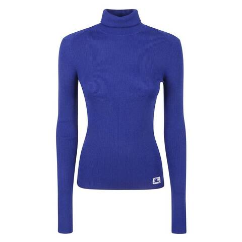 Burberry Ladies Tops. Fashion category: Cardigans & Sweaters. SKU: 8077596. Color: Knight. Burberry Equestrian Knight Roll-Neck Jumper. A wool-blend sweater featuring a ribbed knit high collar, long sleeves, and a straight hem. The slim-fit design is finished with a knitted Equestrian Knight logo for a refined touch. 89% Wool, 11% Polyester. Made in Italy.