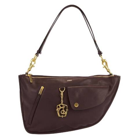 Burberry Ladies Hobo. SKU: 8099251. Color: Berry. Size: 16.9 x 2 x 9.8in. Burberry Shield Twin Leather Bag. This softly structured saddle bag is crafted in Italy from smooth calf leather and lined in supple calf suede for a luxurious finish. Designed with twin compartments featuring signature B-cut zip pulls, it also includes a central open-top compartment, an exterior zip pocket, and an exterior press-stud flap pocket for added practicality. The detachable, adjustable strap allows it to be worn as a shoulder or crossbody bag, while a detachable B charm, hand-painted edges, brushed metal hardware, and an embossed Equestrian Knight Design at the back complete the refined design. Min. strap drop: 11.4in. Max. strap drop: 19.3in. Outer: 100% calf leather. Made in Italy.