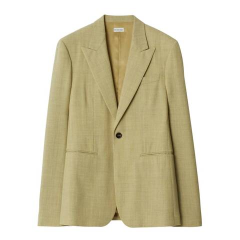 Burberry Mens Outerwear. Fashion category: Coats & Jackets. SKU: 8080488. Color: Hunter. Burberry Mens Tailored Wool Blazer. This blazer is crafted from wool with a tailored cut, featuring peak lapels, front button fastening, and long sleeves with buttoned cuffs. It includes a chest welt pocket, two front jetted pockets, a central rear vent, and a straight hem. The full lining adds an extra touch of refinement. Material: 100% Wool. Made in Italy.