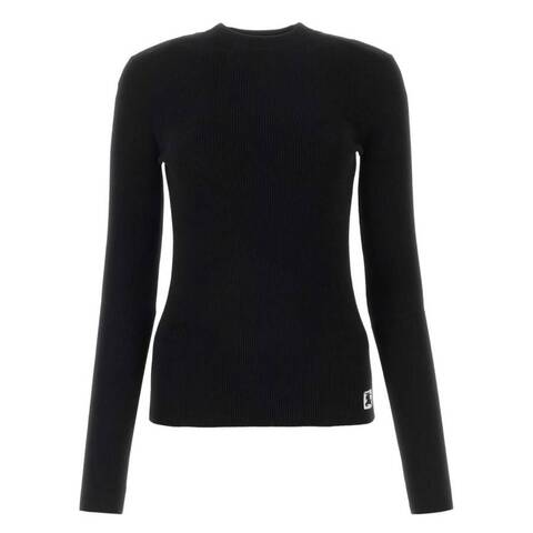 Burberry Ladies Tops. Fashion category: Cardigans & Sweaters. SKU: 8077604. Color: Black. Burberry EKD Wool Blend Sweater. This slim-fit sweater is crafted in Italy from a rib-knit wool blend and features long sleeves and a classic crew neckline. It is finished with the signature Equestrian Knight Design subtly placed at the hem, adding a refined touch to its streamlined silhouette. 89% Wool, 11% Polyester. Made in Italy.