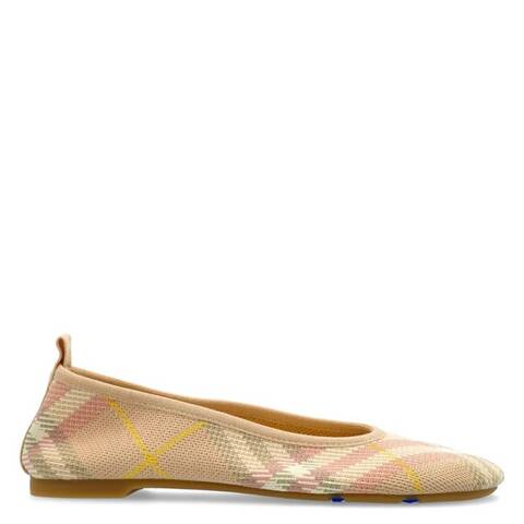 Burberry Ladies Flats. SKU: 8101053. Color: Teacup Ip Check. Burberry Check Jacquard Ballet Flats. These ballet flats are crafted from flexible jacquard knit with comfortable elasticated heels. Designed with the iconic check pattern, they feature slanted square toes that nod to the brands heritage while offering everyday ease. Outer: Polyamide 98%, Elastane 2%. Lining: Sheepskin 90%, Goat Skin 10%. <br/><br/><b>Please visit the brand website for sizing information.</b>