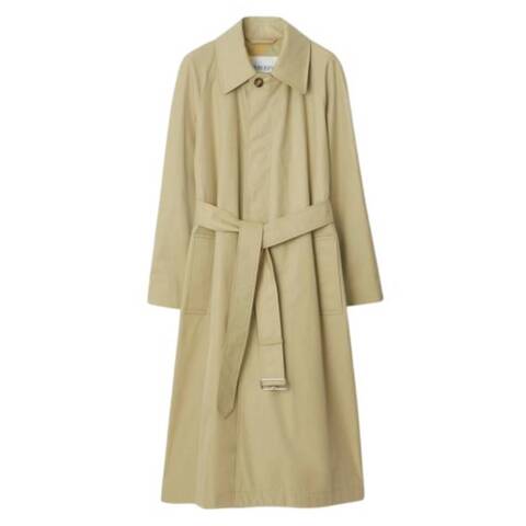 Burberry Ladies Outerwear. Fashion category: Coats & Jackets. SKU: 8077861. Color: Hunter. Burberry Gabardine Bradford Car Coat. Crafted from cotton with tonal stitching for a refined finish. Designed with a pointed flat collar and concealed front button fastening, it offers a sleek and sophisticated silhouette. Silver-tone hardware adds a subtle touch of elegance, while the detachable and adjustable waist belt allows for versatile styling. Long raglan sleeves with buttoned cuffs enhance its classic appeal, complemented by two front welt pockets and a central rear vent for ease of movement. Finished with a straight hem, this coat embodies effortless sophistication. 100% Cotton. Made in Italy.