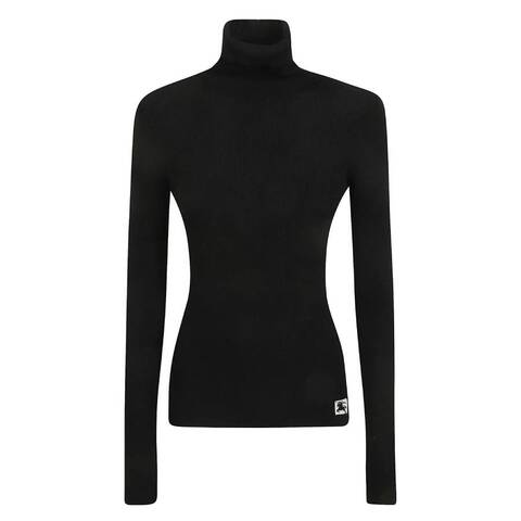 Burberry Ladies Tops. Fashion category: Cardigans & Sweaters. SKU: 8077598. Color: Black. Burberry Wool Blend Turtleneck Pullover. This turtleneck pullover features long sleeves and is finished with an embroidered Equestrian Knight Design patch for a signature touch. 89% wool, 11% polyester. Trim: 82% wool, 10% polyester, 6% polyamide, 2% elastane. Made in Italy.