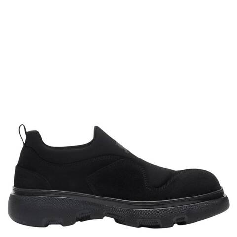 Burberry Mens Sneakers. SKU: 8081570. Color: Black. Burberry Suede Foam Slip-On Sneakers. These slip-on sneakers are made in Italy from calf suede and neoprene. They feature the Equestrian Knight Design and rubber soles moulded with archival Burberry lettering for a signature, contemporary finish. Outer: 68% calf suede, 27% polyamide, 5% elastane. Lining: 75% polyamide, 15% elastane, 10% cotton. Made in Italy. <br/><br/><b>Please visit the brand website for sizing information.</b>
