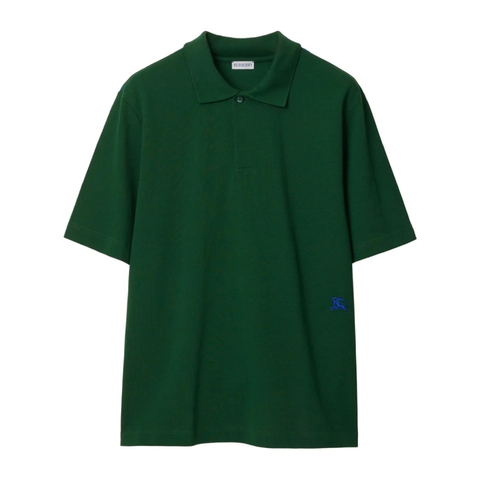 Burberry Mens Tops. SKU: 8083601. Color: Ivy. Burberry Logo Embroidered Polo Shirt. This cotton polo shirt features a signature Equestrian Knight motif, an embroidered logo on the side, a polo collar, a front button placket, short sleeves, and a straight hem. 100% Cotton. Made in Portugal.