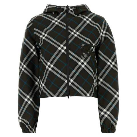 Burberry Ladies Outerwear. Fashion category: Coats & Jackets. SKU: 8105825. Color: Snug Ip Check. Burberry Reversible Cropped Check Jacket. Reversible polyester jacket featuring all-over Burberry Check embroidery, accented with an Equestrian Knight patch on the front. Designed with a drawstring hood, zip-front closure, and two front zip pockets. Finished with elasticized cuffs, a drawstring hem, and a contrasting interior equipped with two slit pockets. 100% Polyester.