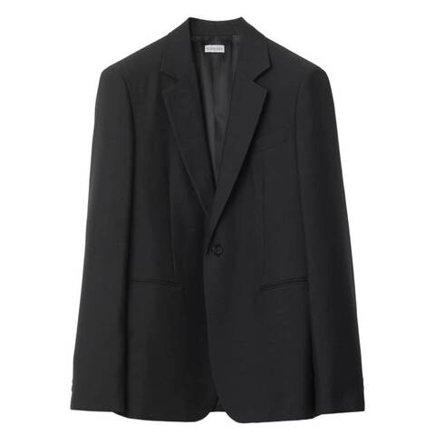 Burberry Mens Outerwear. Fashion category: Blazers. SKU: 8083804. Color: Black. Burberry Single-Breasted Tailored Wool Blazer. This wool blazer is tailored to a sharp, structured cut for a polished silhouette. Designed with peak lapels and a front button fastening, it delivers a timeless, sophisticated look. Long sleeves with buttoned cuffs, a chest welt pocket, and two front jetted pockets add classic tailoring details, while the central rear vent and straight hem ensure comfort and ease of movement. Outer: Wool 100%. Made in Italy.