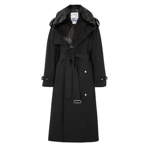 Burberry Ladies Outerwear. Fashion category: Coats & Jackets. SKU: 8083641. Color: Black. Burberry Double-Breasted Kennington Trench Coat. This trench coat by Burberry is crafted from water-resistant gabardine and designed in an oversized silhouette for a modern take on a classic. It features a removable faux-fur collar for added texture, along with the iconic House Check cotton lining. Finished with a double-breasted snap closure, notched lapels, epaulets, a storm flap, belted cuffs, side welt pockets, and a removable belt. 72% Cotton; 20% Viscose; 8% Polyester.