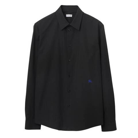 Burberry Mens Tops. Fashion category: Dress Shirts. SKU: 8083067. Color: Black. Burberry Long-Sleeved Cotton EKD Dress Shirt. This long-sleeved Burberry shirt is crafted from heavy cotton poplin and embroidered with the signature Equestrian Knight Design. Tailored in Italy for a slim fit, it features a button-front closure, point collar, single-button cuffs, and a curved hem. 100% Cotton. Made in Italy.