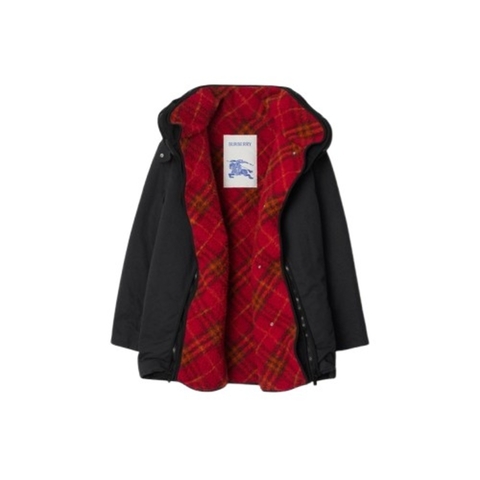 Burberry Ladies Outerwear. Fashion category: Coats & Jackets. SKU: 8099345. Color: Black. Burberry Womens Detachable Warmer Cotton Parka. Oversized parka crafted in Italy from heavyweight cotton canvas, featuring a shield-shaped throat latch and an appliqued leather B shield. Zip closures reveal contrasting panels in washed nylon-cotton twill, while a detachable fleece warmer, jacquard-woven with the Burberry Check and finished with the Equestrian Knight Design label, adds extra warmth. The parka is detailed with a press-stud and zip front closure, packaway drawcord hood, drawcord waist, side press-stud welt pockets, press-stud tab cuffs, and the appliqued B shield on the sleeve. The fleece warmer secures with a press-stud closure and features the Equestrian Knight Design label at the back. Material: 100% cotton. Made in Italy.