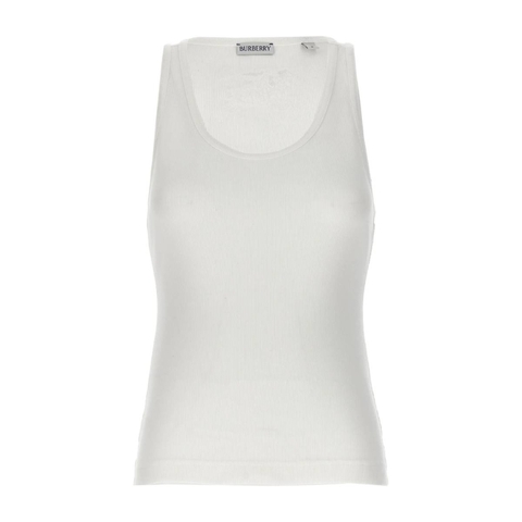 Burberry Ladies Tops. Fashion category: Tank Tops. SKU: 8088282. Color: Salt. Burberry Womens Logo Embroidery Tank Top. This cotton tank top features a sleeveless design with a classic round neckline, a fitted silhouette, and a ribbed texture, finished with an embroidered logo for a subtle branded accent. Composition: 95% cotton, 5% elastane. Made in Portugal.
