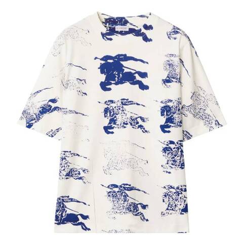Burberry Ladies Tops. Fashion category: T-Shirts & Henleys. SKU: 8082128. Color: Rain. Burberry All Over EKD Print T-Shirt. The Burberry Mens All-Over EKD Print T-Shirt is crafted from breathable white cotton jersey for all-day comfort. Designed with off-duty style in mind, it features a contrasting blue logo print throughout, a classic collar, short sleeves, straight hem, and a regular fit. 100% Cotton. Made in Italy.
