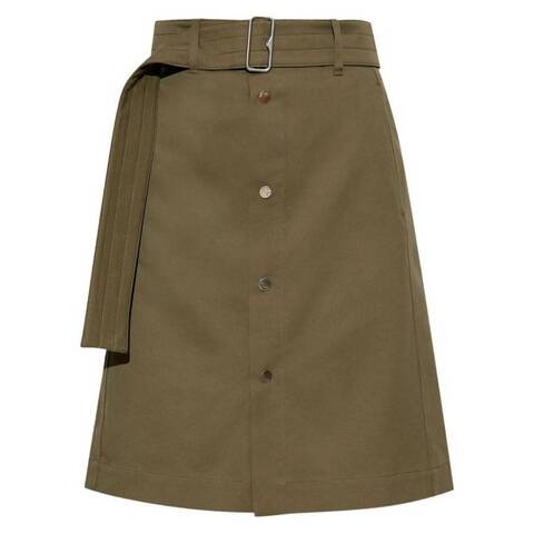 Burberry Ladies Bottoms. Fashion category: Skirts. SKU: 8093945. Color: Khaki. Burberry Belted Buttoned Midi Skirt. This midi skirt is crafted from durable twill fabric and features a front snap-button and hook-and-bar closure. Designed with an elasticated back and optional belt for a customizable fit, it includes side slant pockets and a back slit for ease of movement. 51% Cotton, 35% Viscose, 14% Polyester.