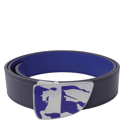 Burberry Mens Belts. Fashion category: Belts. SKU: 8092103. Color: Slate/Knight. Burberry Reversible Leather Shield EKD Belt. Crafted from grainy calf leather, this piece features hand-painted edges, a folded shield with an enamelled Equestrian Knight design, an adjustable fit, and a reversible design. 3.5cm/1.4in wide. 100% calf leather. Made in Italy.