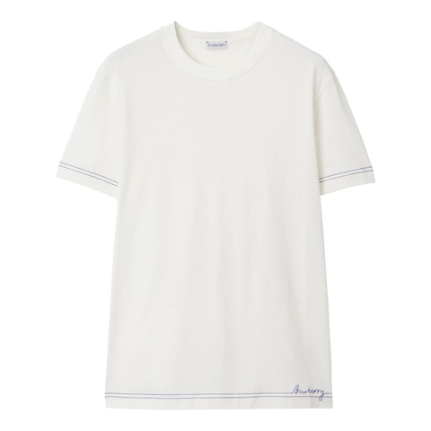 Burberry Mens Tops. Fashion category: T-Shirts & Henleys. SKU: 8090542. Color: Salt. Burberry Logo-Embroidered Cotton Crewneck T-Shirt. This t-shirt features a jersey texture, contrast stitching at the cuffs and hem, an embroidered logo at the hem, a crew neck, short sleeves, and a straight hem. 100% cotton. Made in Portugal.
