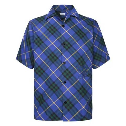 Burberry Mens Tops. Fashion category: Casual Button-Downs. SKU: 8090647. Color: Bright Navy Ip Chk. Burberry EKD Check Cotton Poplin Shirt. This short-sleeved shirt is crafted from Italian-woven cotton poplin and features the iconic Burberry Check pattern. It is appliqued with the Equestrian Knight Design at the front and cut to a relaxed fit. Additional details include a spread collar, button closure, and a straight hem. 100% Cotton.