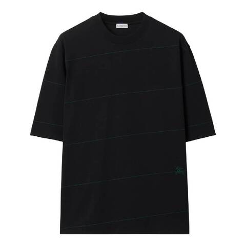 Burberry Mens Tops. Fashion category: T-Shirts & Henleys. SKU: 8083613. Color: Black. Burberry Striped Cotton Jersey T-Shirt. A cotton jersey T-shirt featuring screen-printed stripes and an embroidered Equestrian Knight Design. Cut to a regular fit, it is finished with short sleeves and a straight hem. 100% Cotton. Made in Italy.