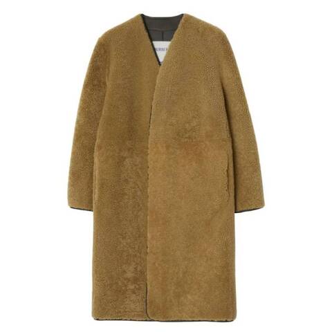 Burberry Ladies Outerwear. Fashion category: Coats & Jackets. SKU: 8077433. Color: Moss. Burberry Womens Moss Collarless Shearling Maxi Coat. This coat is crafted from sheepskin shearling and features a collarless design, long sleeves, two side slit pockets, a straight hem, and a longline silhouette. Material: 100% Spanish farmed and dyed sheepskin. Made in Italy.