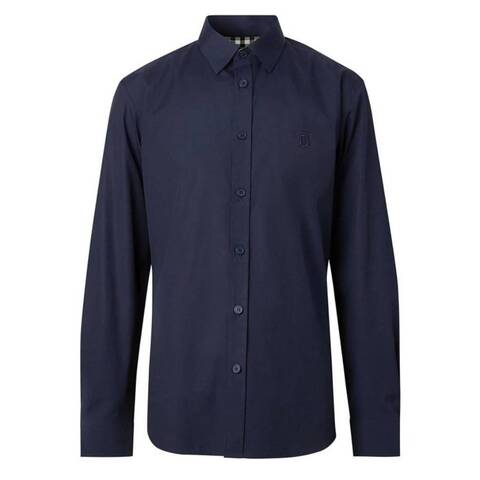 Burberry Mens Tops. Fashion category: Casual Button-Downs. SKU: 8032306. Color: Navy. Burberry Sherwood Monogram Motif Poplin Shirt. This slim-fit shirt is crafted from stretch-cotton poplin for a refined, comfortable silhouette. It features an embroidered Thomas Burberry Monogram at the chest, adding a signature touch. The point collar and curved hem enhance its tailored look, while single-button cuffs can be turned up to reveal a subtle flash of the iconic Burberry Check. 97% cotton, 3% elastane.