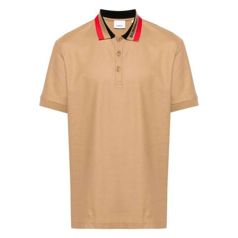 Burberry Mens Tops. SKU: 8083155. Color: Camel. Burberry Edney Contrasting-Collar Cotton Polo Shirt. A cotton polo shirt crafted with a pique weave, featuring a contrasting collar, jacquard logo motif, and stripe trim. Designed with a polo collar, front button placket, short sleeves with ribbed cuffs, and short side slits. Finished with a straight hem for a classic look. Cotton 100% Made in Italy.